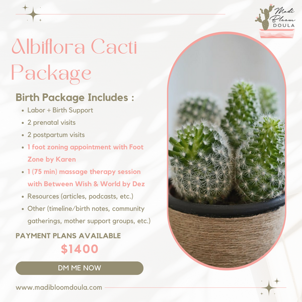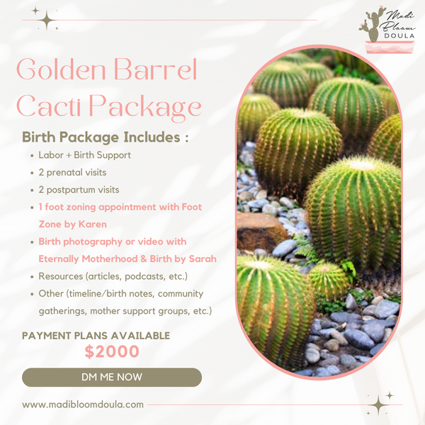 Labor + Birth Support, 2 prenatal visits, 1 postpartum visits, 1 foot zoning appointment with Foot Zone by Karen, Resources (articles, podcasts, etc.), and more!